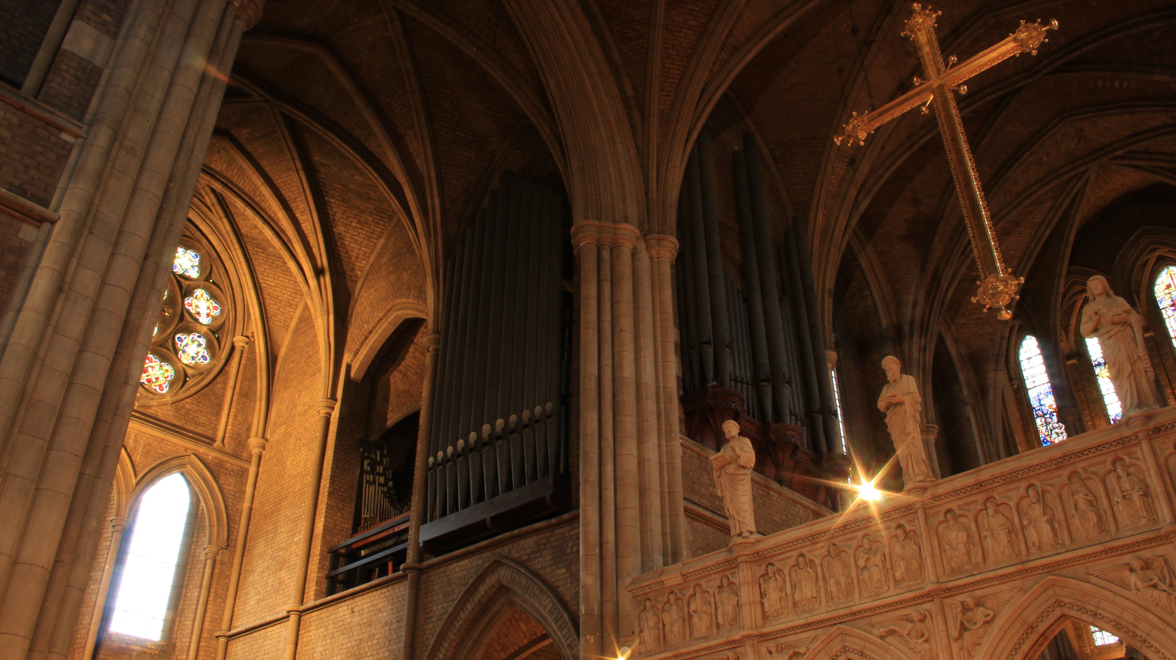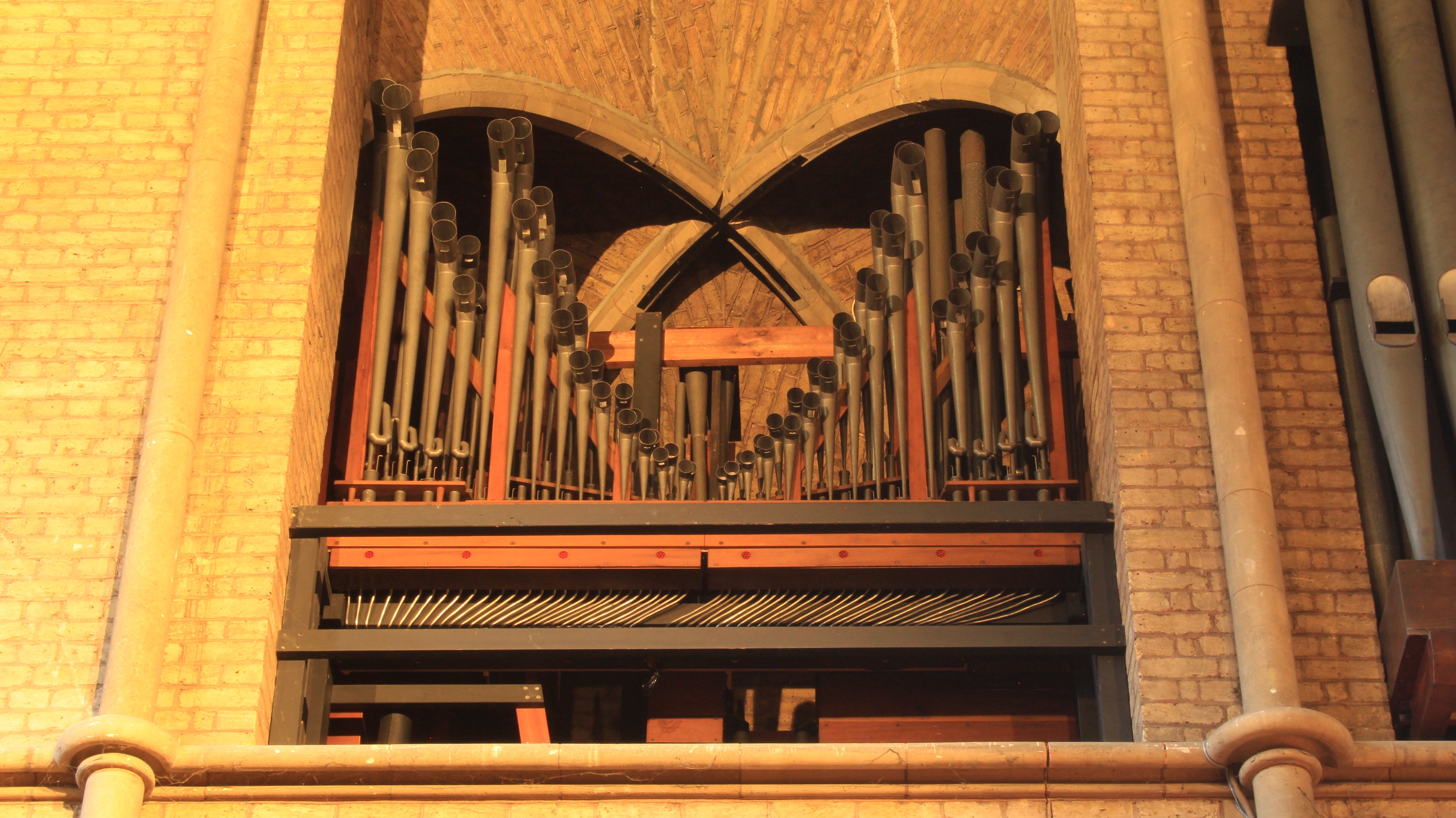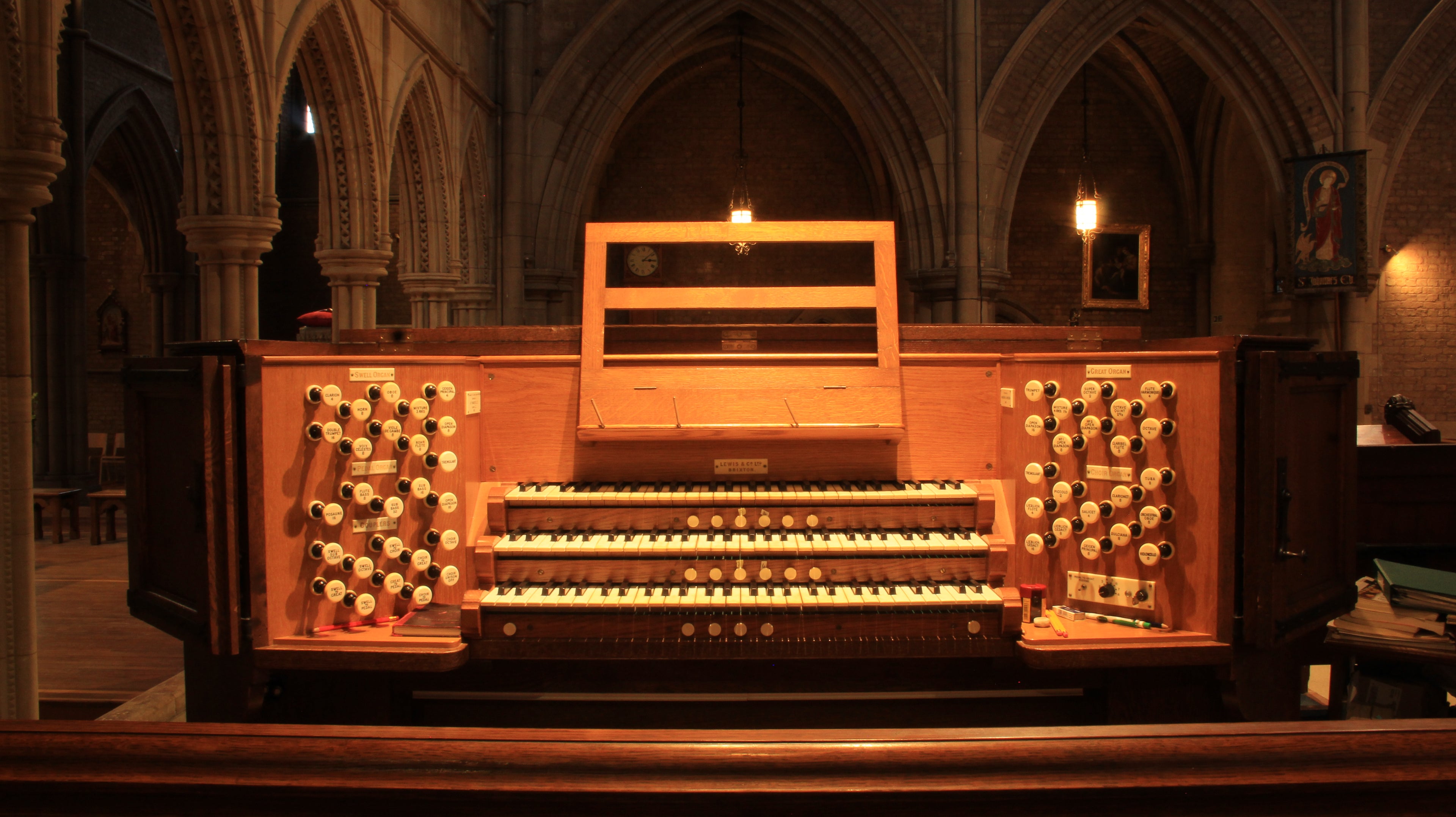 The magnificent church was designed by J L Pearson and was consecrated in 1887. The organ was built by T.C. Lewis, beginning with the Choir Organ, which was first used in 1882 when the eastern part of the church was taken into use; the rest of the instrument followed in stages. It stands in a chamber high in the north transept, facing south and west. The detached console was originally placed at floor level opposite the organ, in the south chancel aisle; the action was, even at that early date, electro-pneumatic. This became unreliable, and in 1912 Lewis & Co changed it to pneumatic, with a new console on the north side of the chancel.