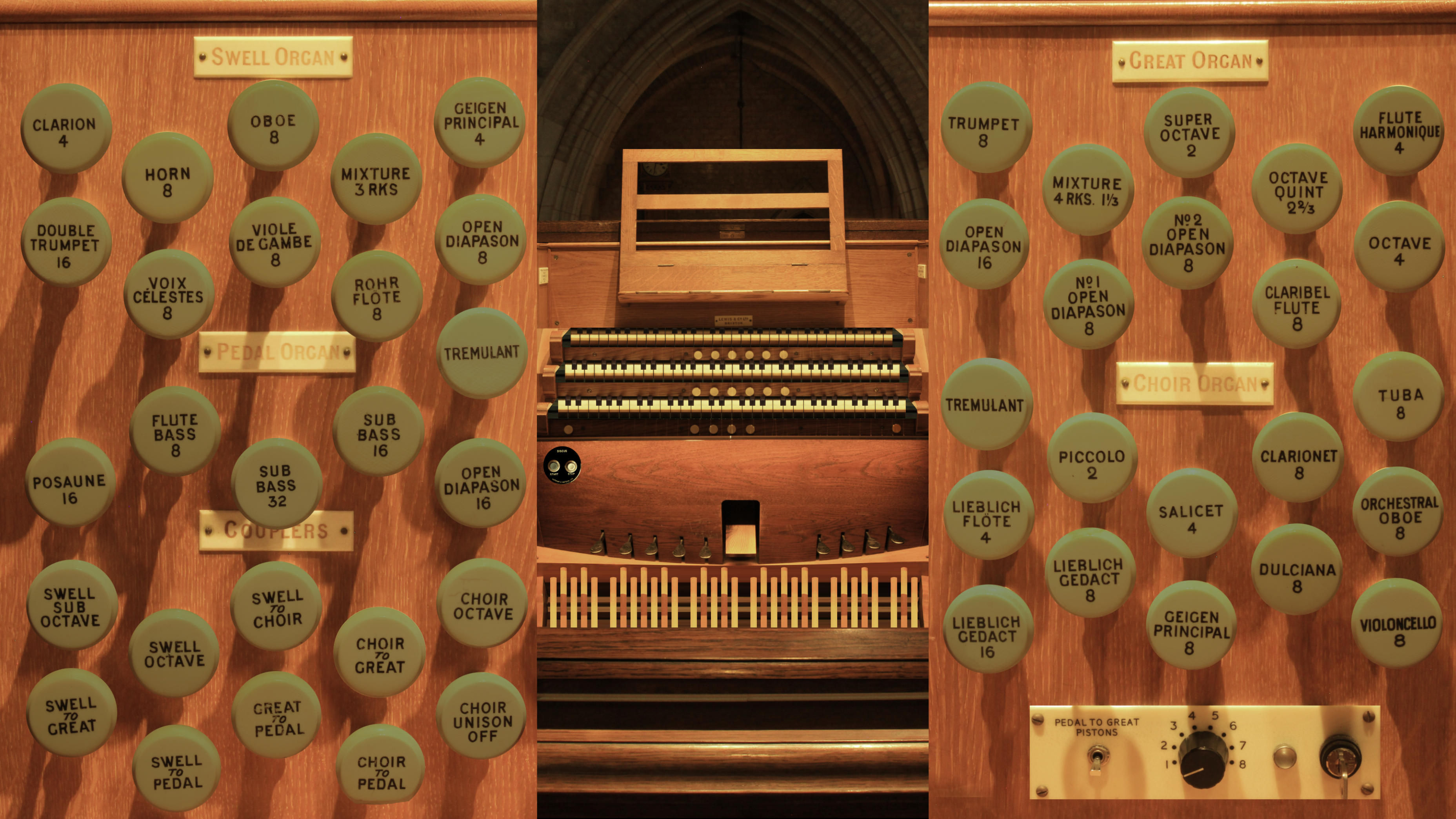 From 1920 onwards, various alterations were made by Henry Willis & Sons, who had taken over the Lewis firm: these included the addition of a Pedal Trombone and Choir Tuba and the displacement of the Choir Salicet by a Nazard. In 1927, the actions were converted back to an electro-pneumatic system. Following war damage, repairs were undertaken by N P Mander in 1947.
